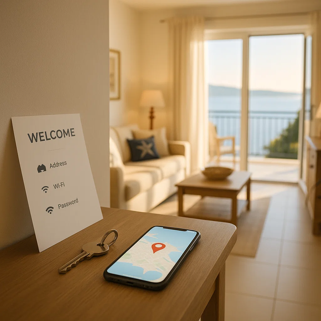 Before arrival you receive check-in info (address, parking, Wi-Fi, house rules).